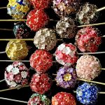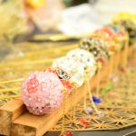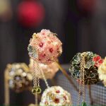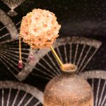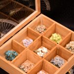 ワイヤーで形を作り、特殊なディップ液にくぐらせてガラスのような透明感を持たせた後、裏から伝統色のマニキュアを塗って、ゴールドやシルバーの輝きを引き立てています。