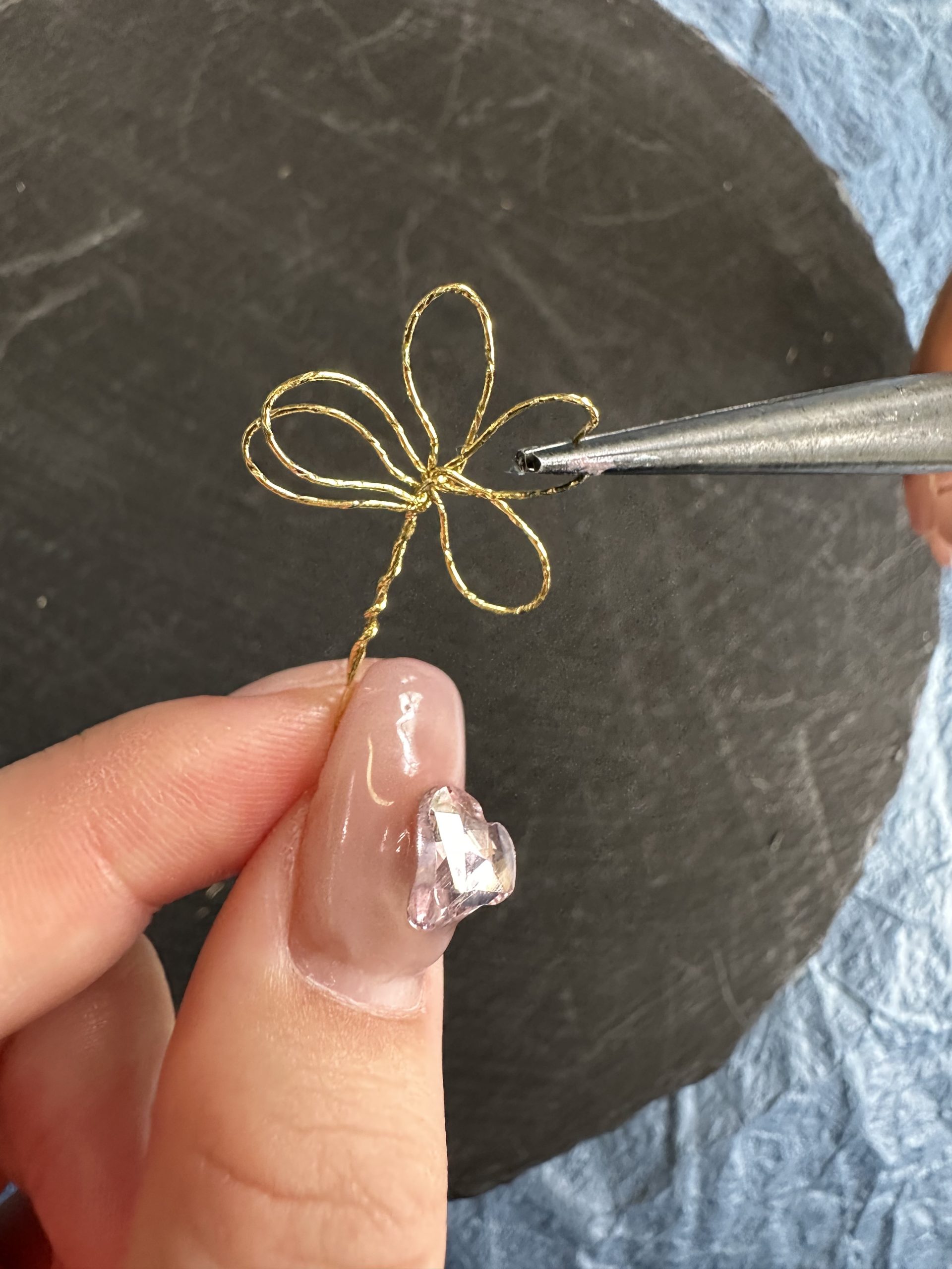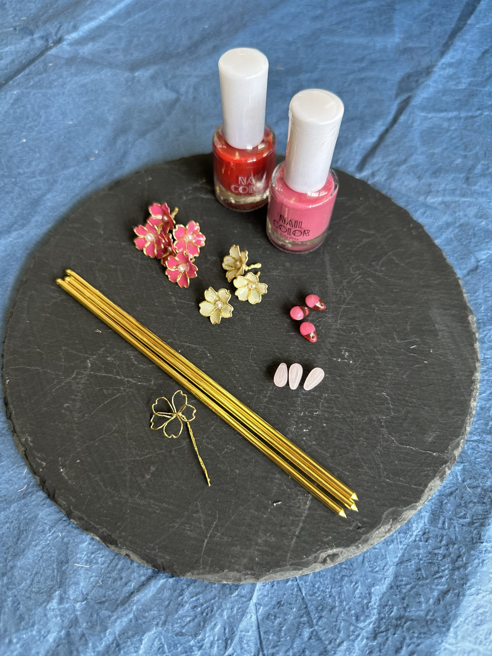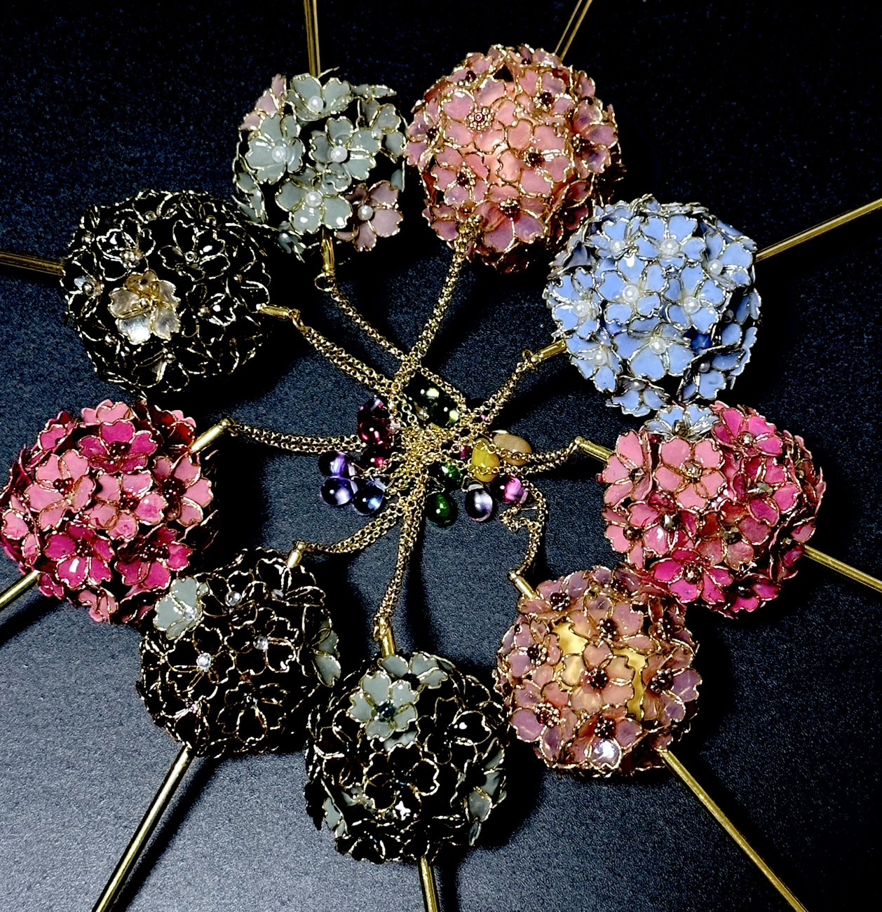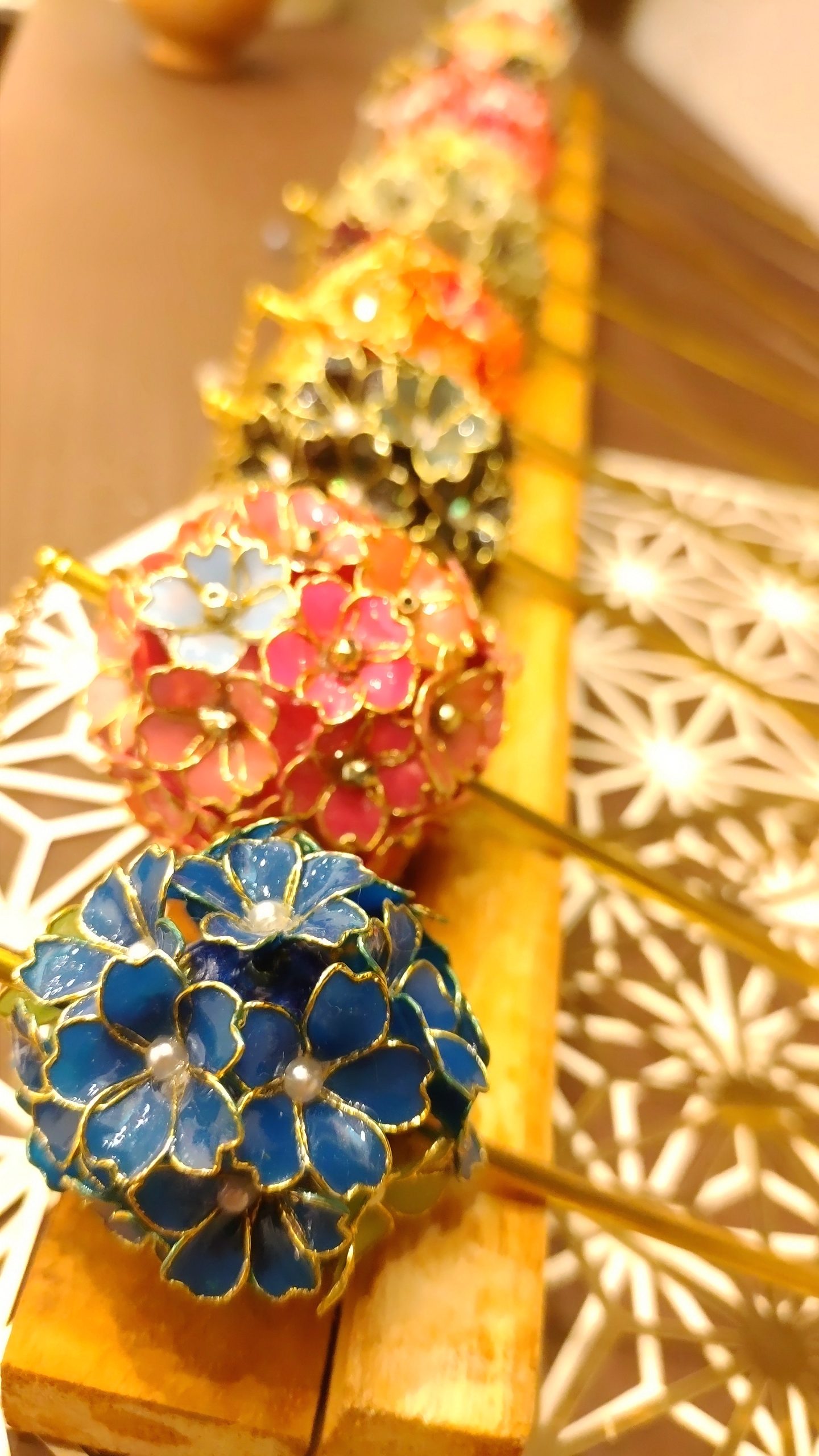ワイヤーで形を作り、特殊なディップ液にくぐらせてガラスのような透明感を持たせた後、裏から伝統色のマニキュアを塗って、ゴールドやシルバーの輝きを引き立てています。