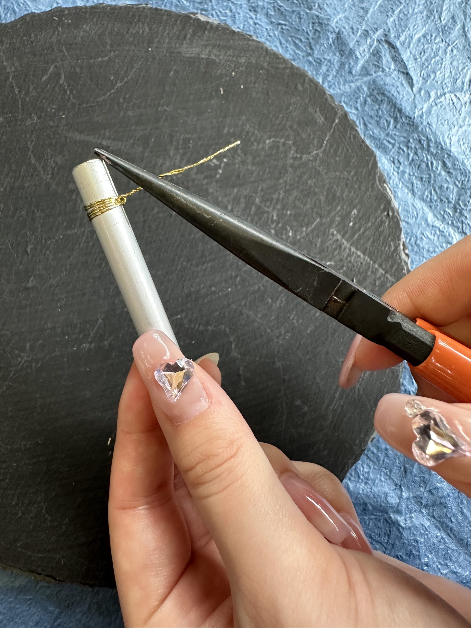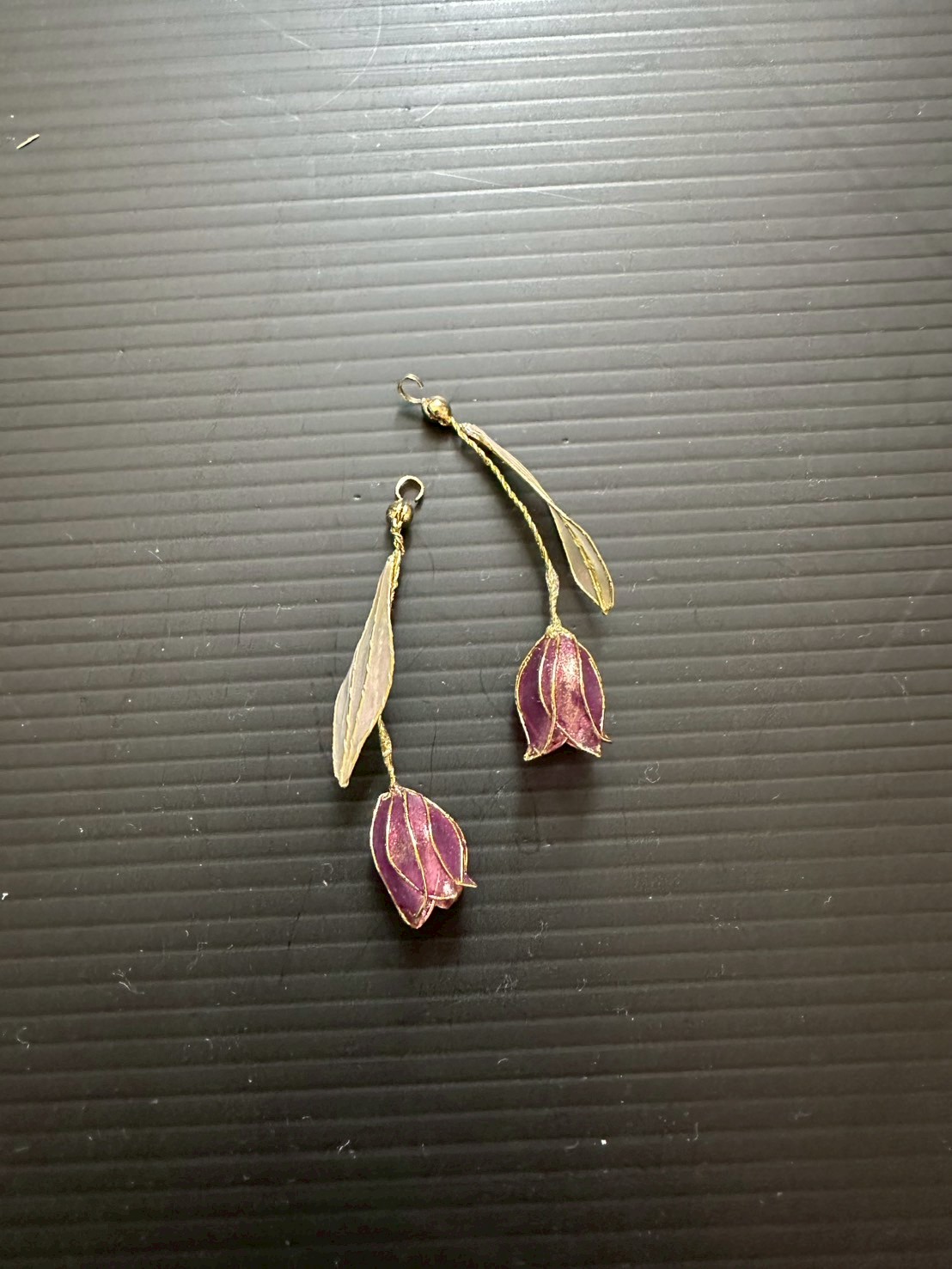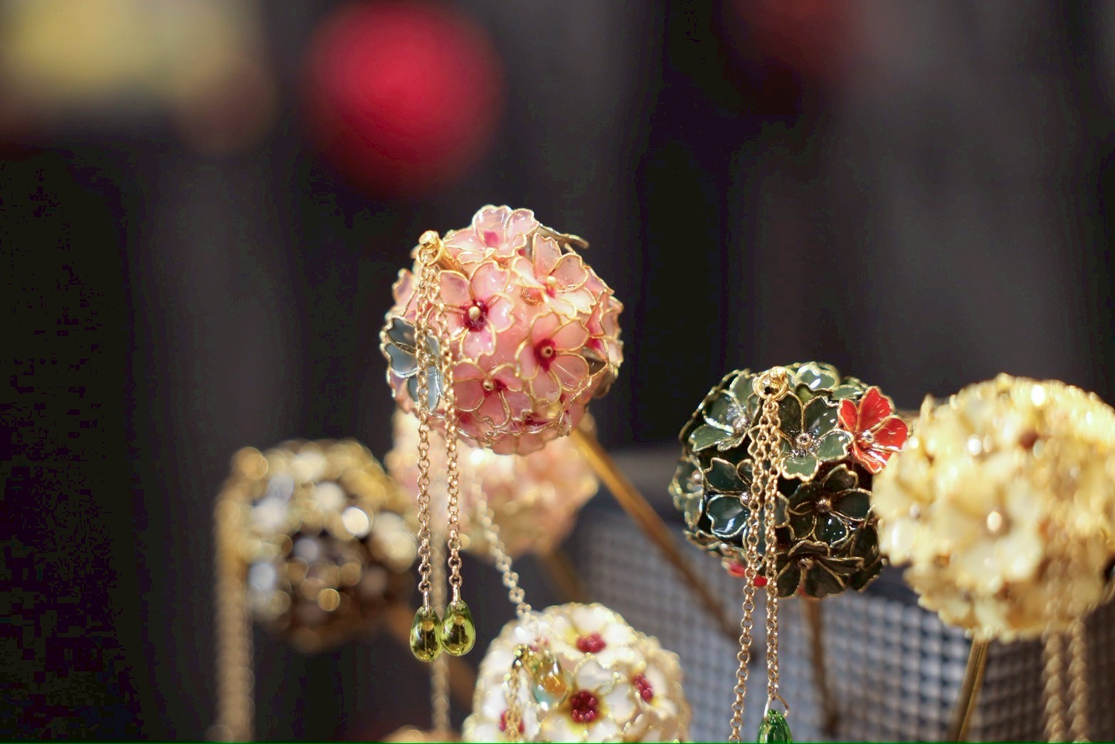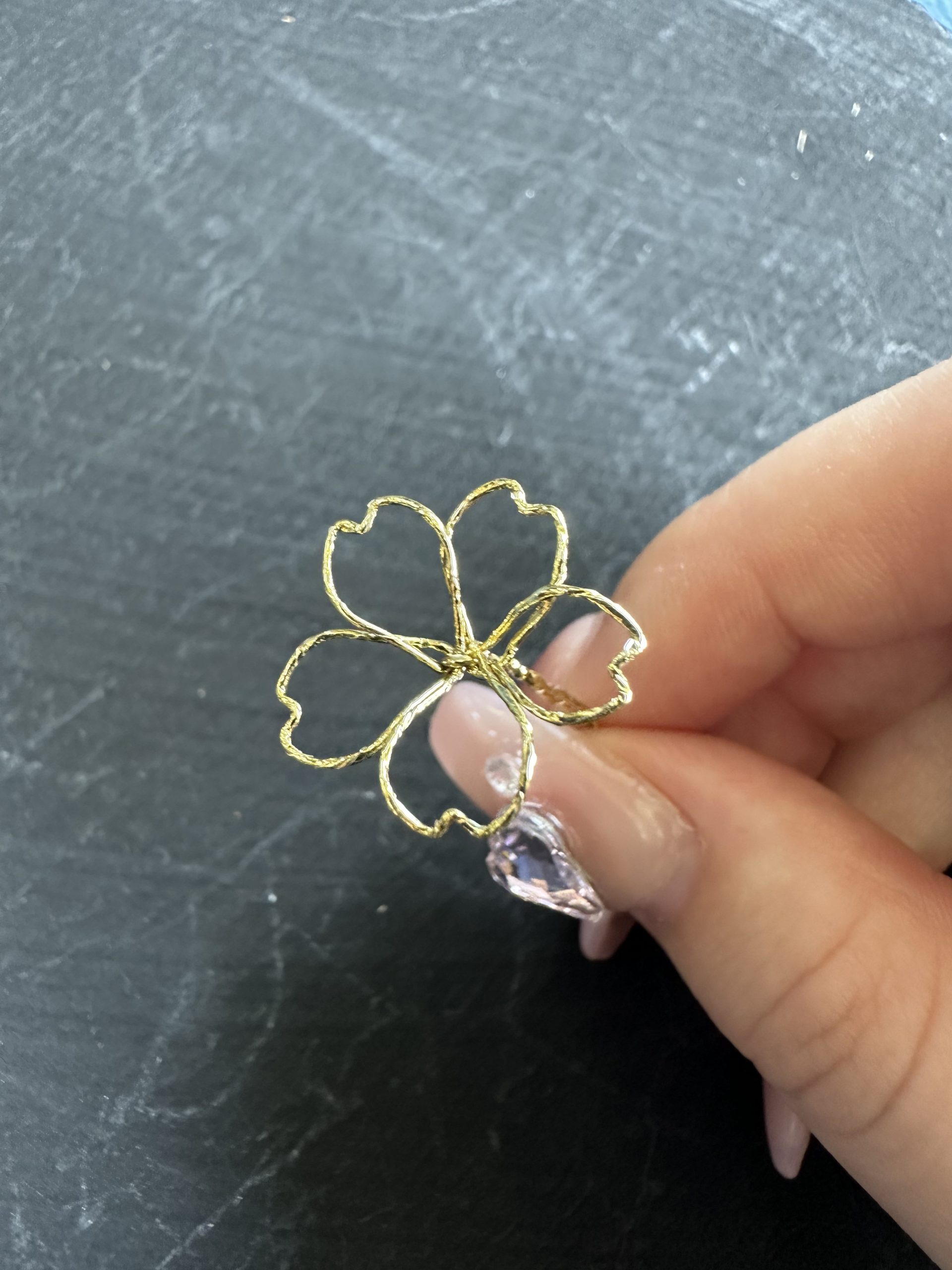 ワイヤーで形を作り、特殊なディップ液にくぐらせてガラスのような透明感を持たせた後、裏から伝統色のマニキュアを塗って、ゴールドやシルバーの輝きを引き立てています。
