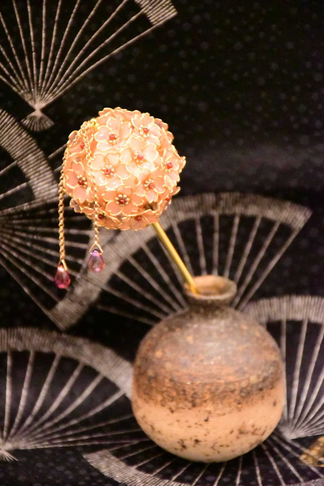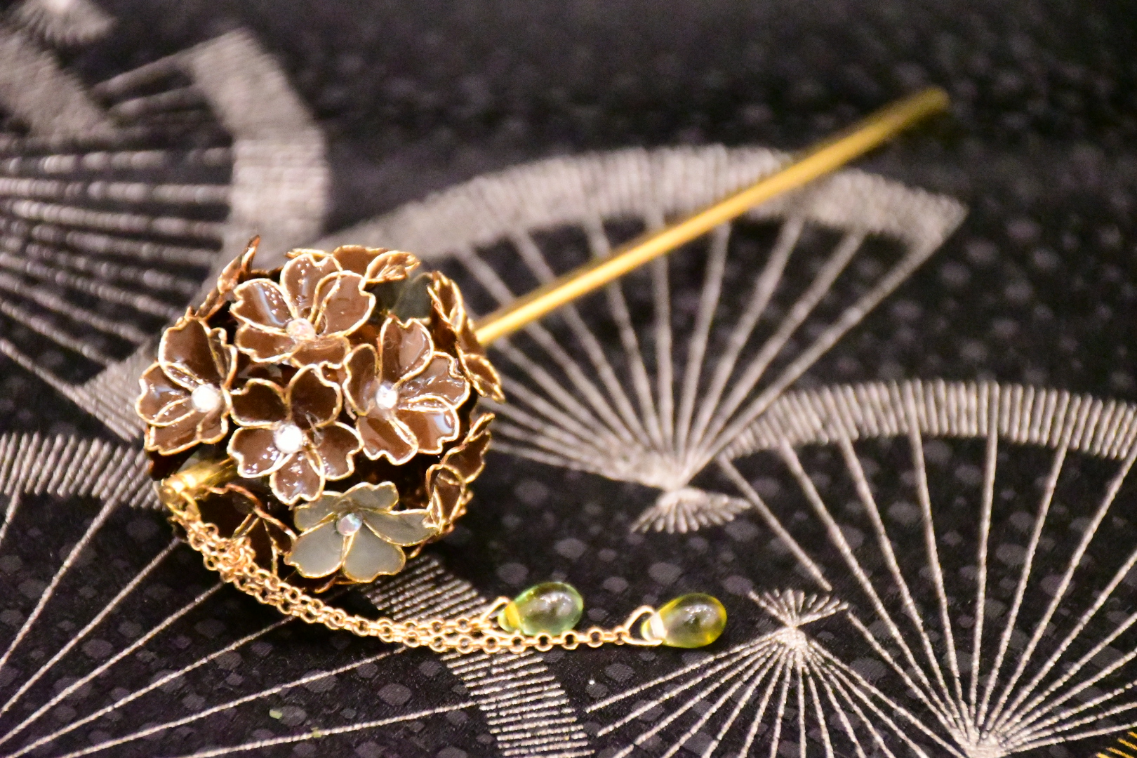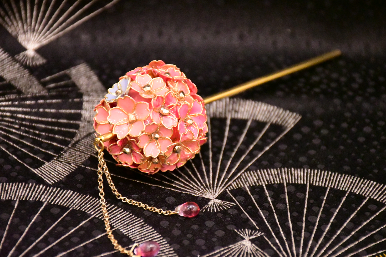 華かんざしは、日本の伝統美を感じさせる桜をモチーフにした、下がり雫が印象的な髪飾りです。